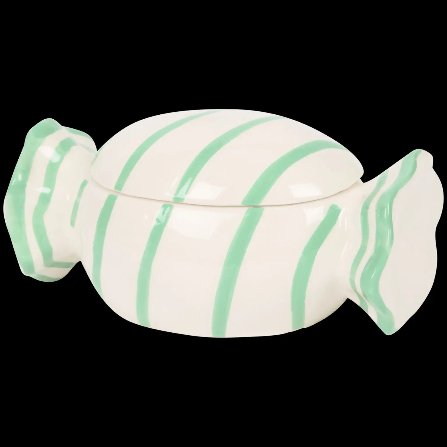 Dekoratív, cukorka alakú kerámia cukortartó fedővel, fehér–zöld csíkos kivitelben. Ideális cukorka vagy bonbon tárolására, dekorációnak is kiváló. Méret: 19×11×9 cm.